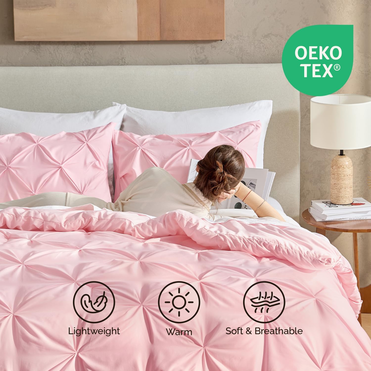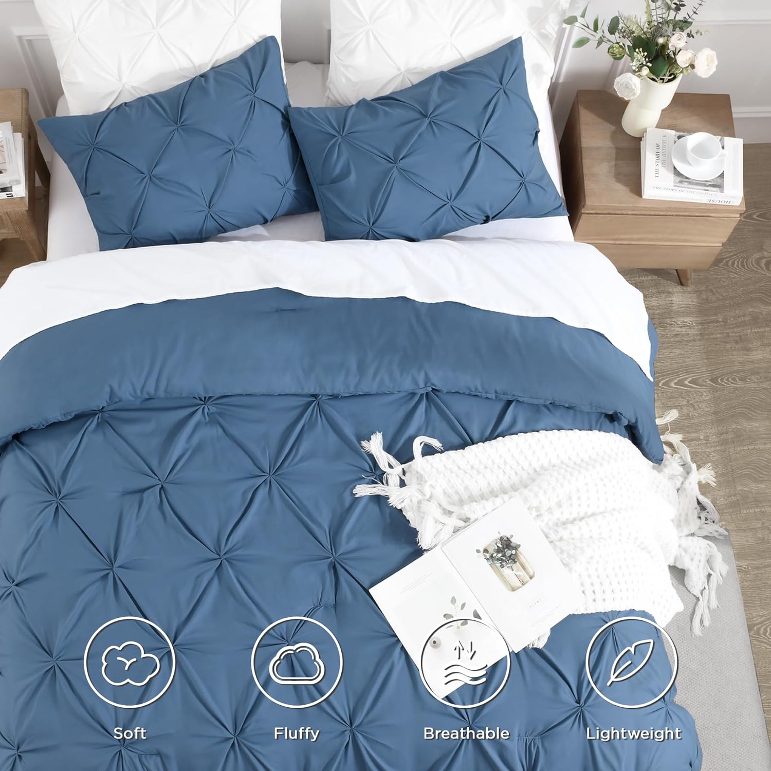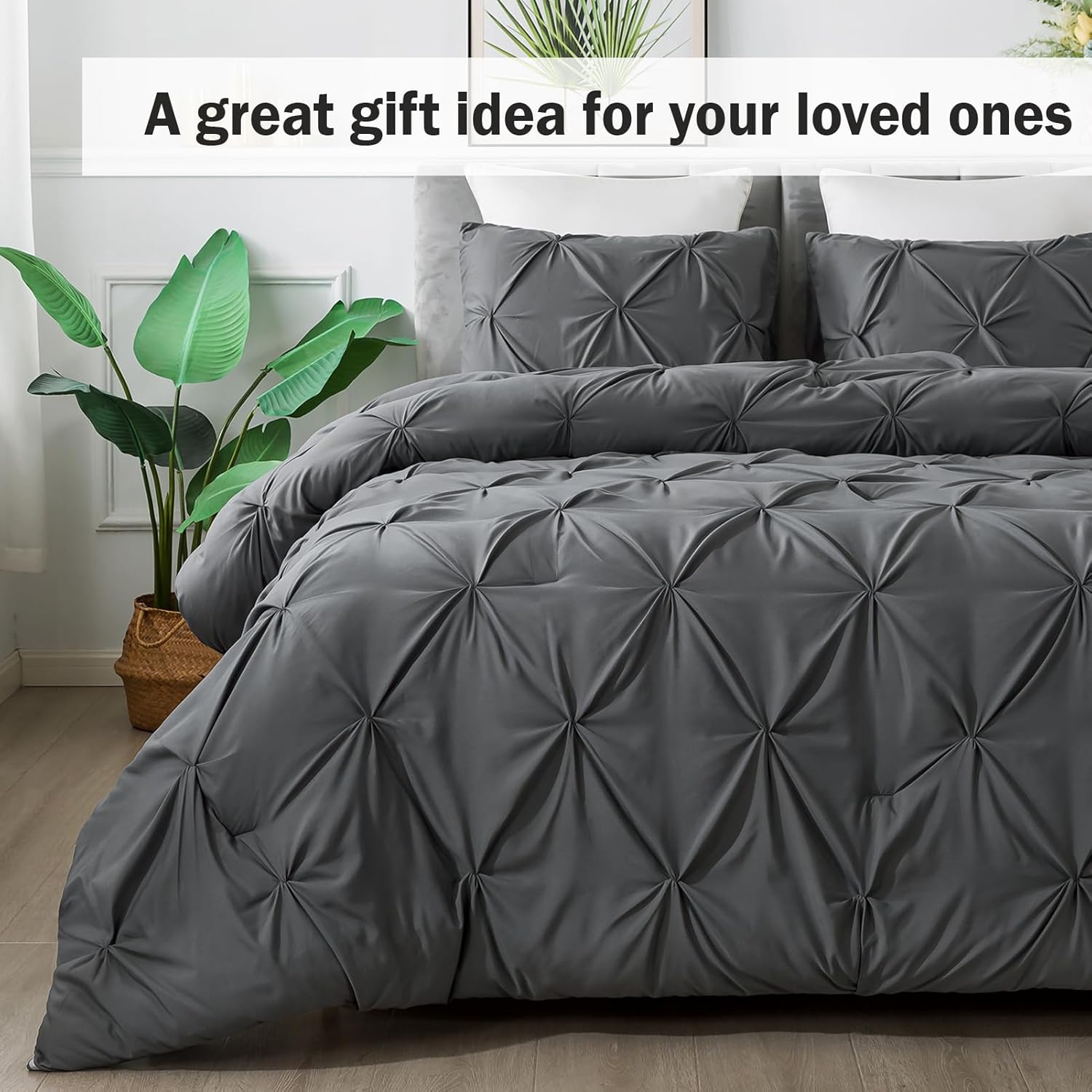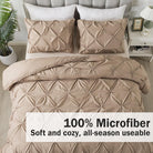 - ALL SEASON SUITABLE: Super soft microfiber bedding set is suitable for all seasons, warm and lightweight. Due to the vacuum packaging, after you get the comforter out, please hold four corners of the comforter to stretch a while and shake it several times, so that the whole comforter could become normal and the pinch pleat design will be more obvious.