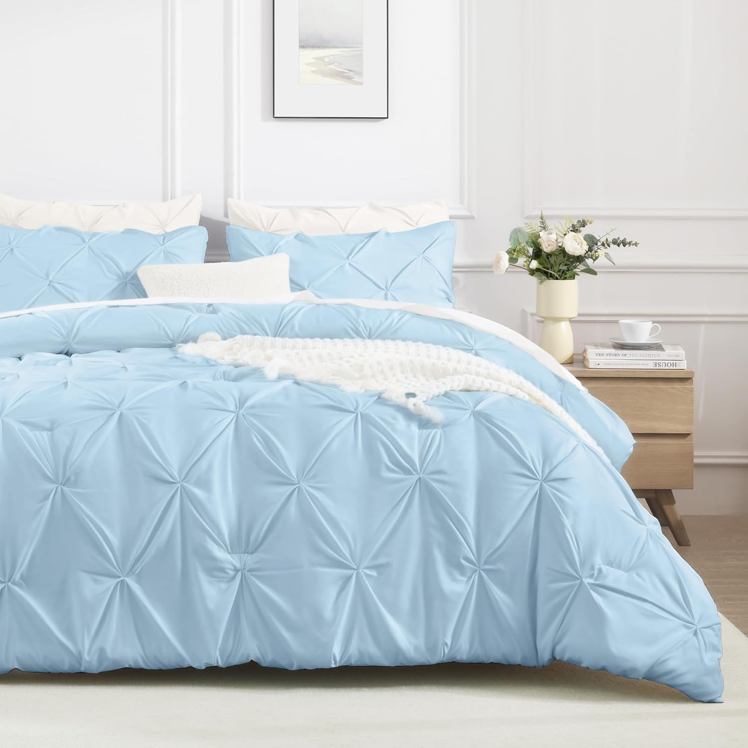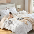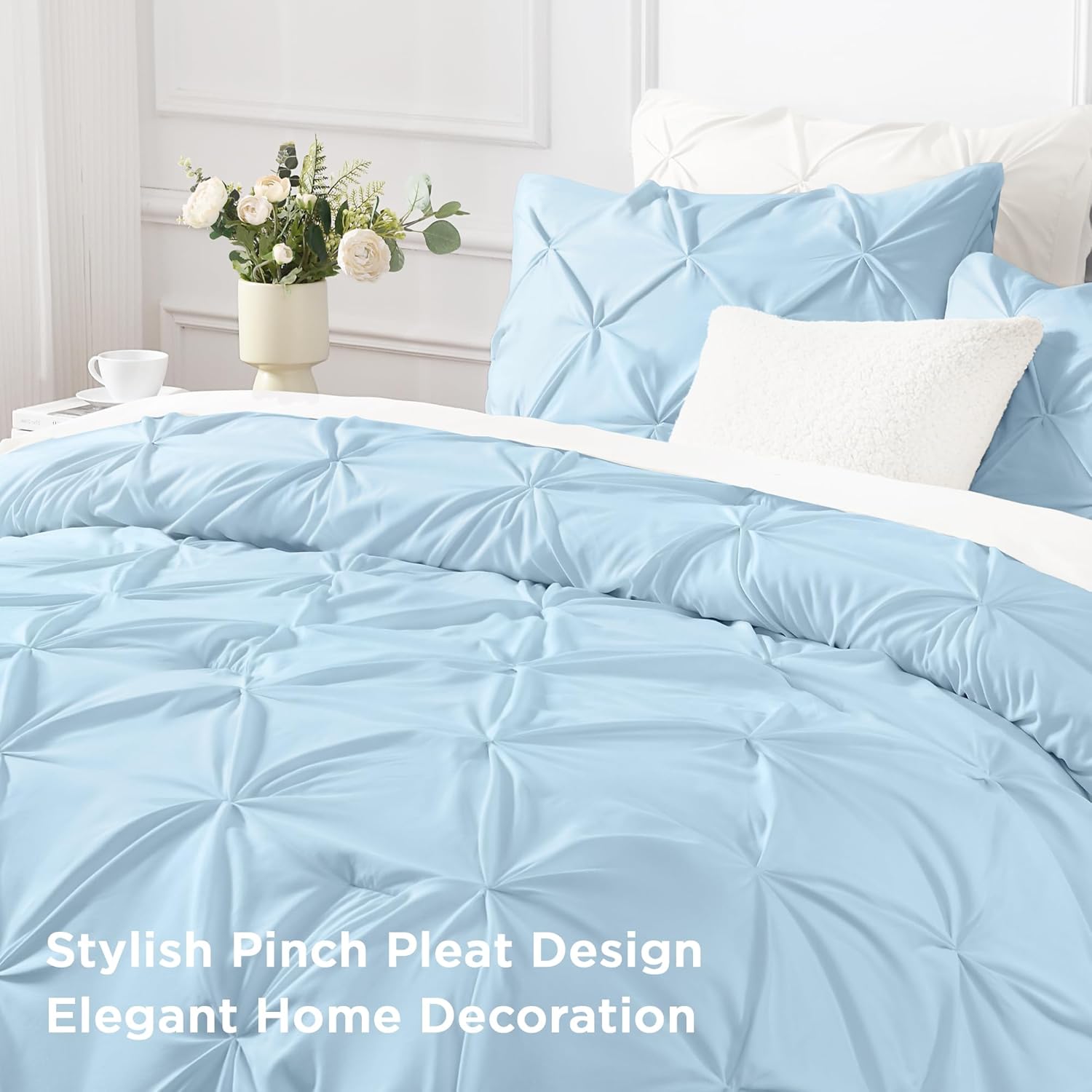 - PINCH PLEAT COMFORTER SET: White pintuck comforter, modern and fashionable. Decorate your bed with this pinch pleat microfiber comforter set, bring your room lavish and elegant atmosphere. Classic white comforter set coordinates easily with your existing room decorations. Beauty and function are perfectly integrated with this pinch pleat comforter set.